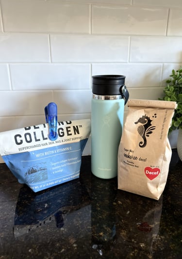 I also make my coffee at home every morning. I buy a flavored Swiss water decaf from a small specialty shop in Cape May, mix in my Live Conscious Beyond Collagen Powder, and pour it into my Hydro Flask Flex Sip Coffee Tumbler. This container keeps my coffee hot for hours and has been the perfect way to enjoy my morning routine whether I am home or heading out for the morning.